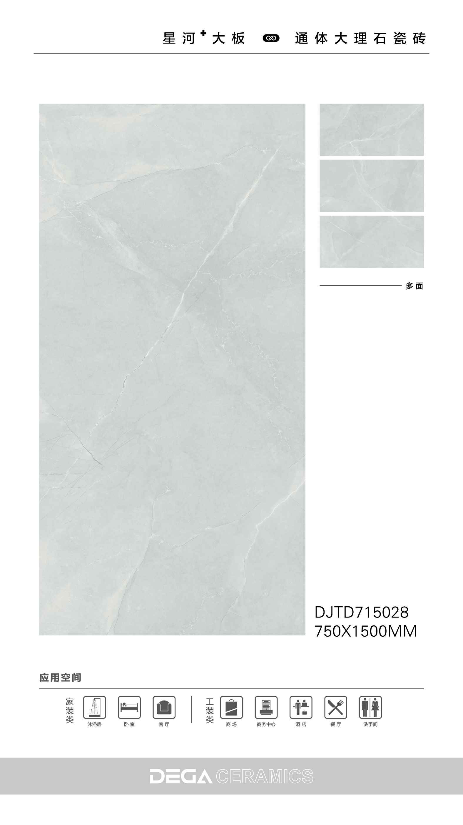 从规格形式的选择、纹理的趣味,到丰富内涵的表现、文化的传承等…… 都是她的每一侧面,在750X1500MM创造的舞台中央,是属于一片瓷砖传奇剧的演出。